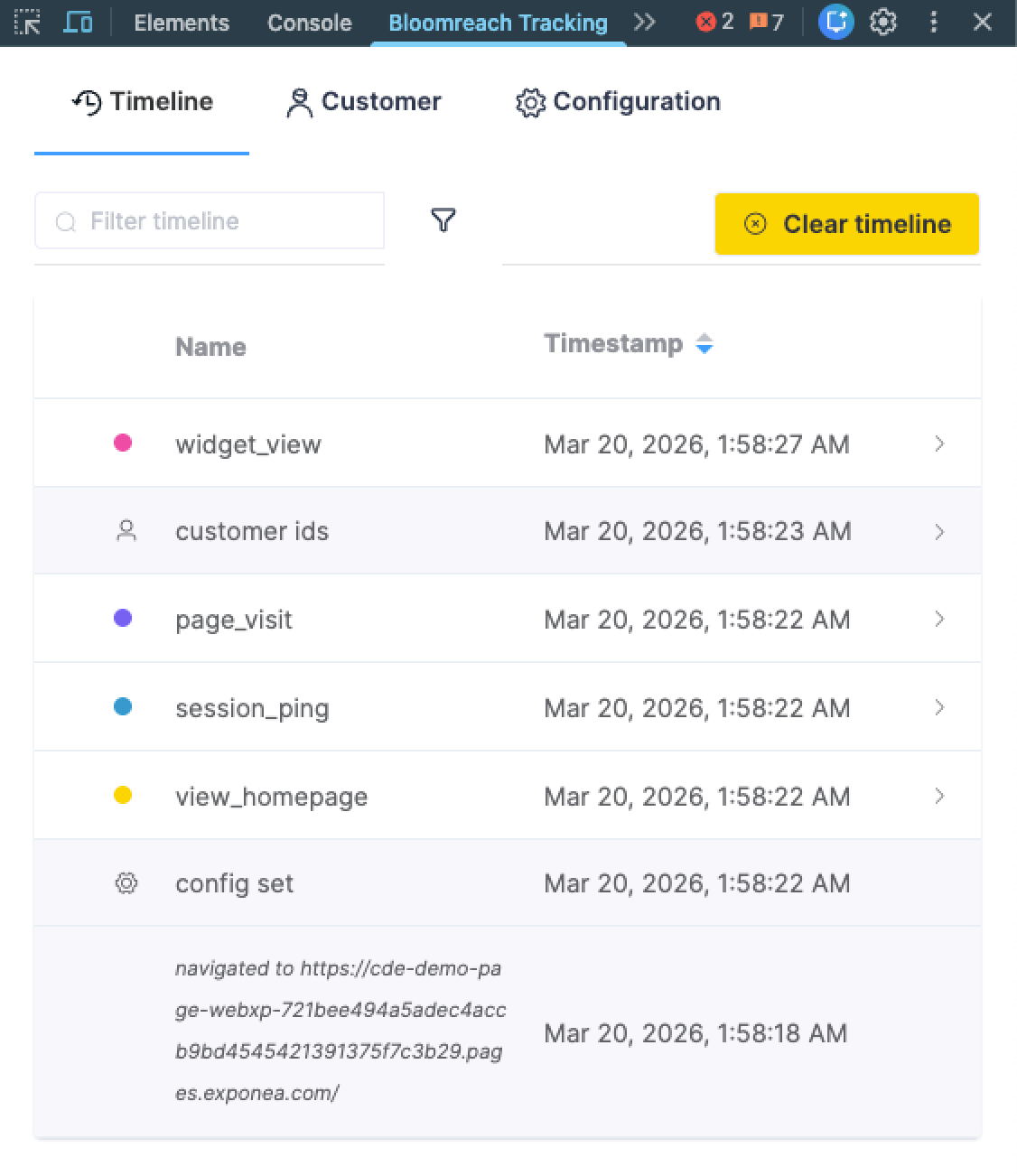Displays all events fired on the current page in real time, including their event type, properties, metadata, and timestamps. Use this tab to confirm that tracking calls are firing at the right moments. For example, check that view_item fires when a product detail page loads, or that cart_update fires when a visitor adds an item to the cart.