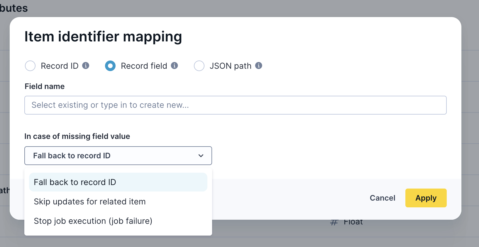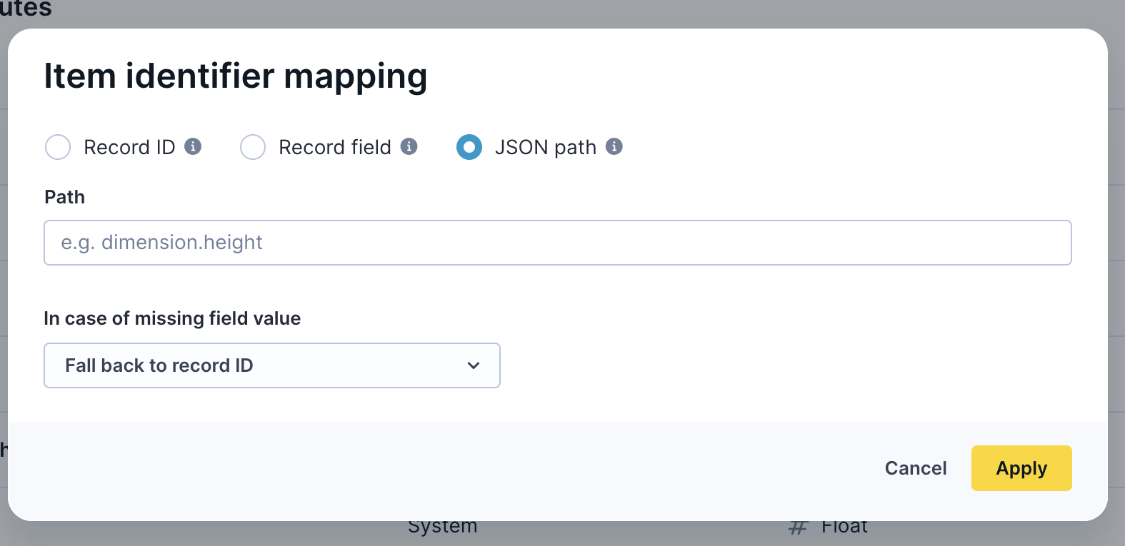 This defaults to Record ID. Alternatively, you can choose a Record field or JSON path as the item ID.