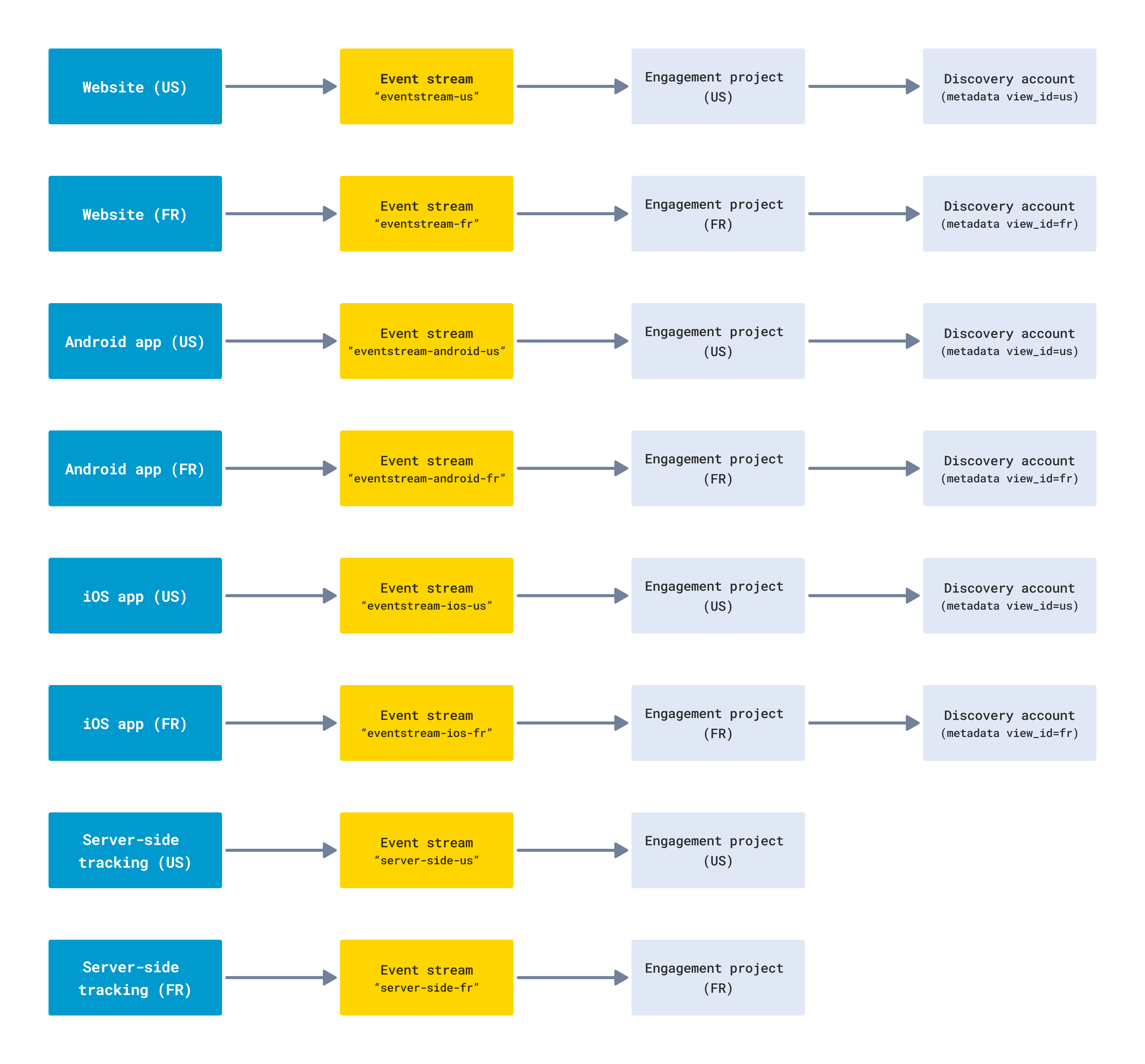 Multiple locales with separated data: Create one Event stream per locale, naming each to include the locale identifier (like "eventstream-us" or "eventstream-fr"). Connect each locale-specific Event stream to its corresponding Engagement project while connecting all Event streams to your single Discovery account. This pattern gives you: