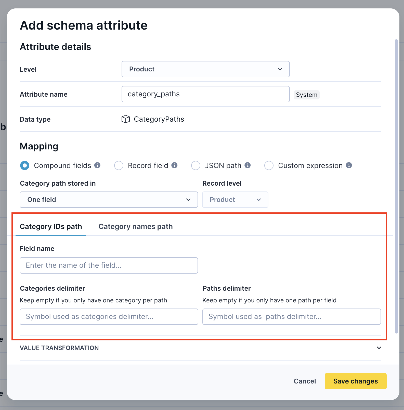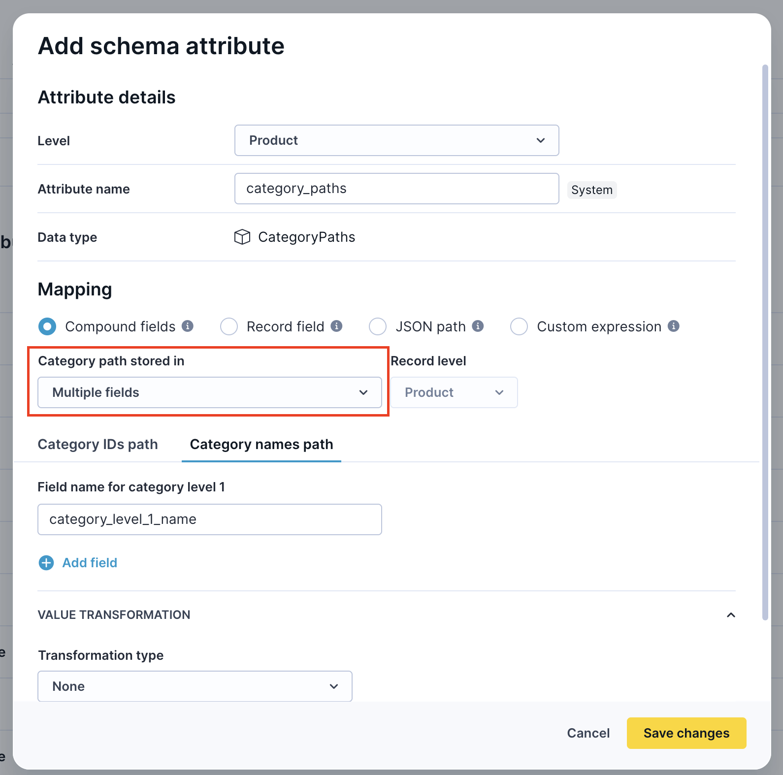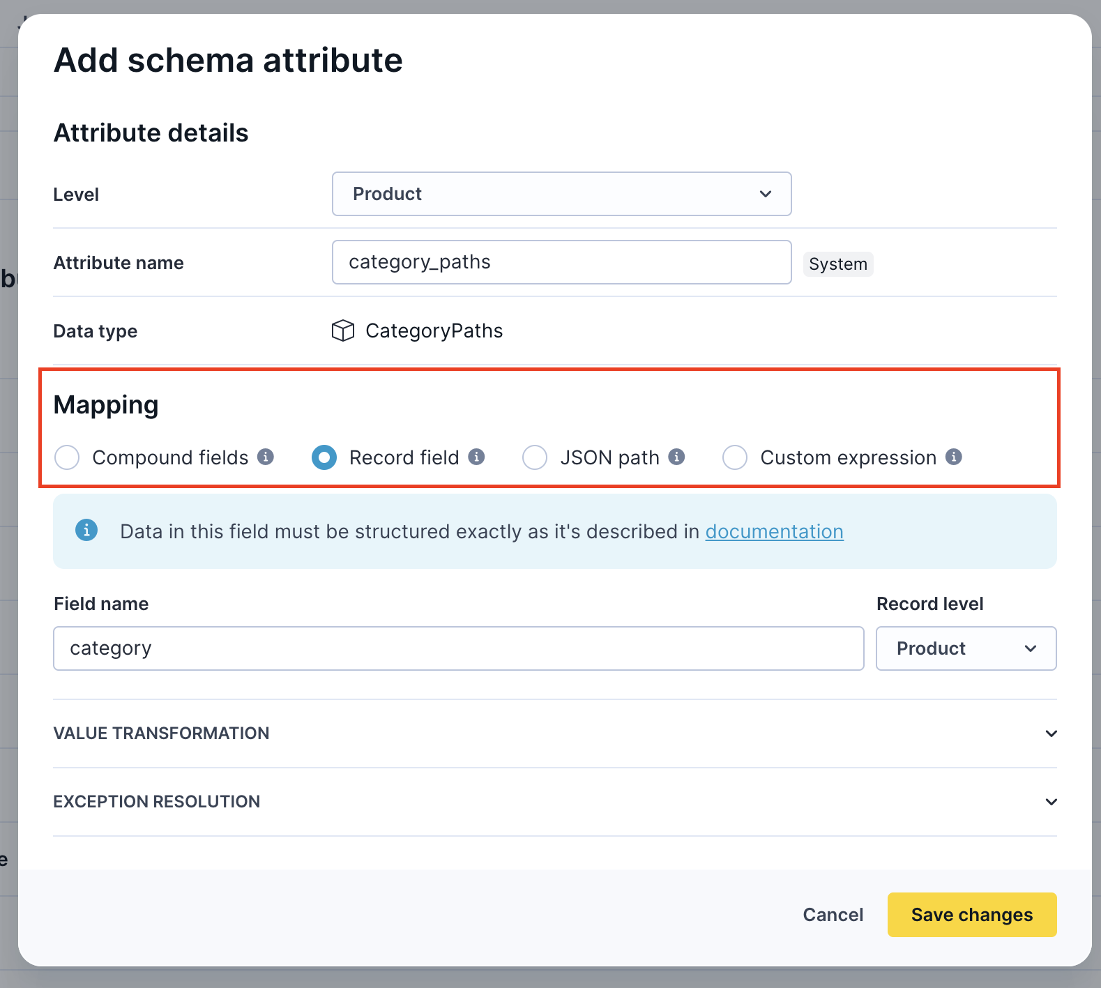 After adding the category_paths attribute, you can choose from four mapping options: Compound fields, Record field, JSON path, or Custom expression.