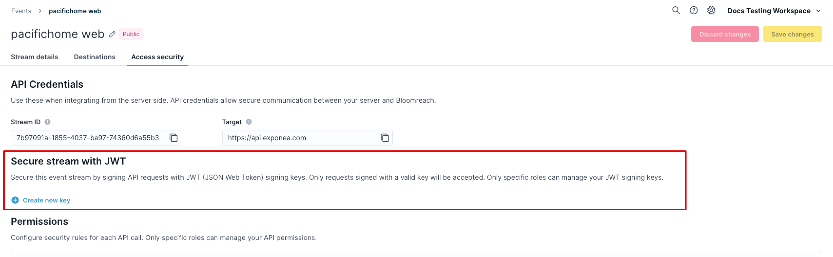 Generate a JWT signing key in Events > your stream > Access security > Secure stream with JWT. Store the secret securely in your backend.