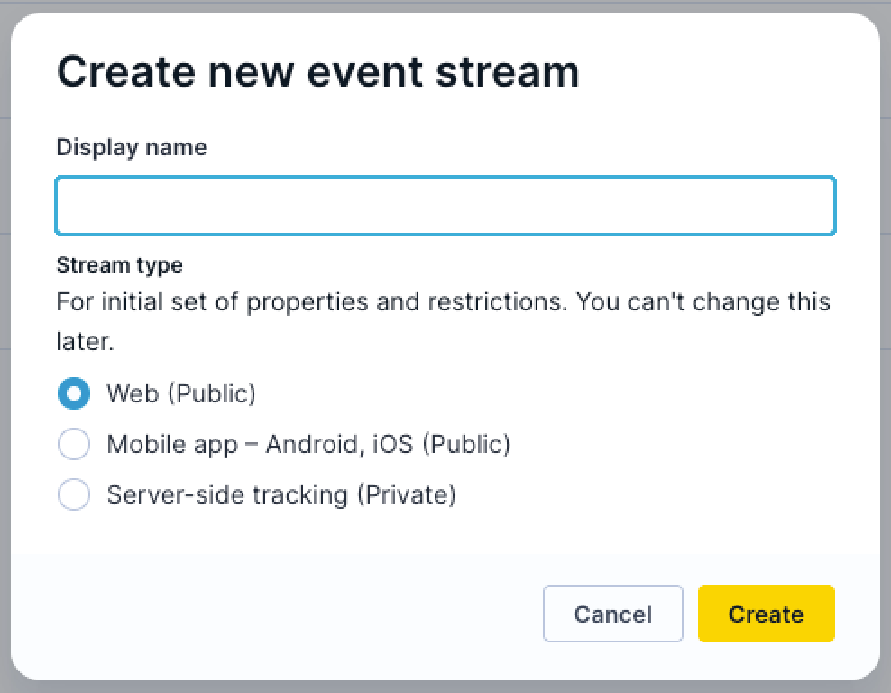 Public stream templates pre-configure common SDK identifiers and a standard set of web event types such as page_visit, view_item, and purchase. Use these as a baseline for browser and mobile app tracking.