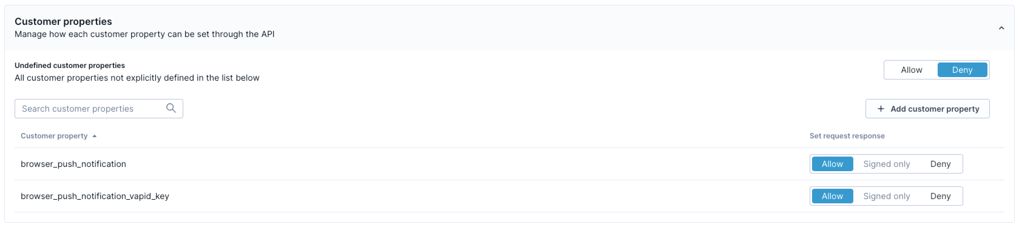 Once JWTs are flowing from your updated clients, switch the relevant customer IDs, event types, and properties from Allow to Signed-only in the Permissions tab.