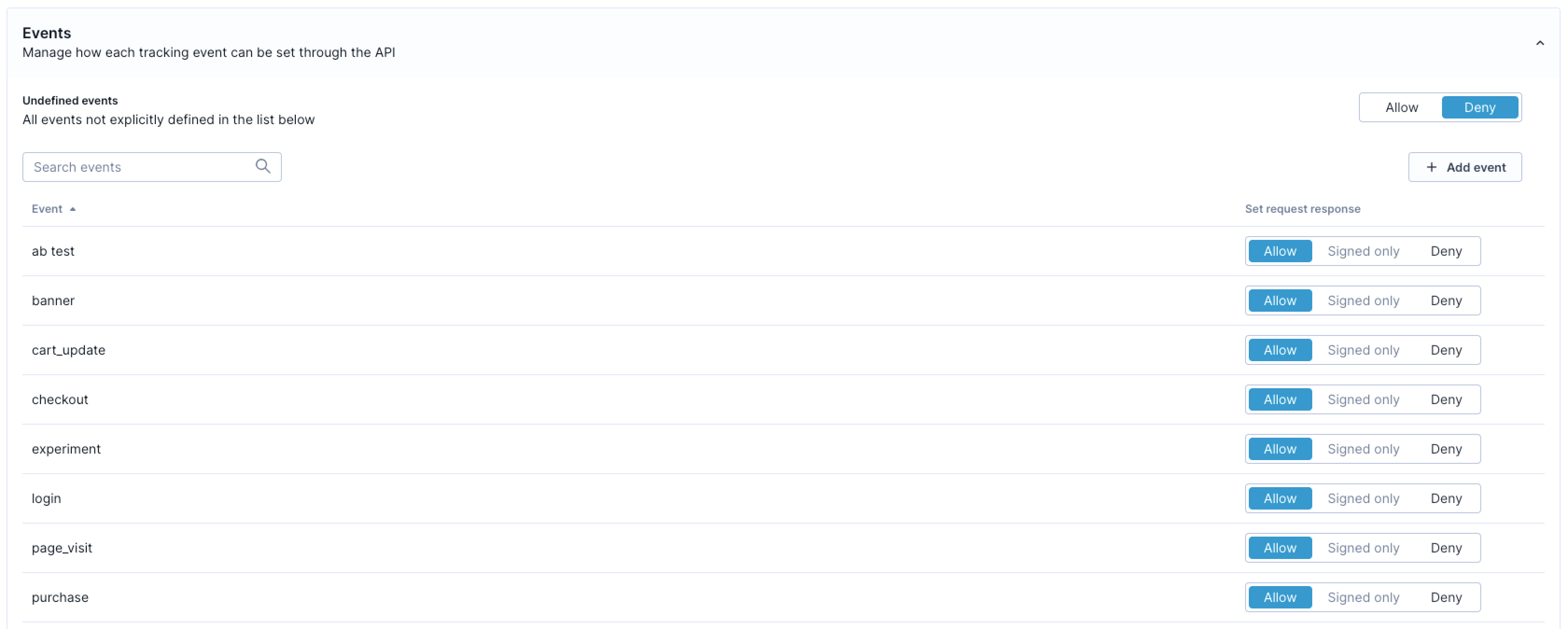 Deny undefined event types to prevent schema drift. If a new event type needs to be tracked, define it in your data model first, then add it to the stream's allow-list.