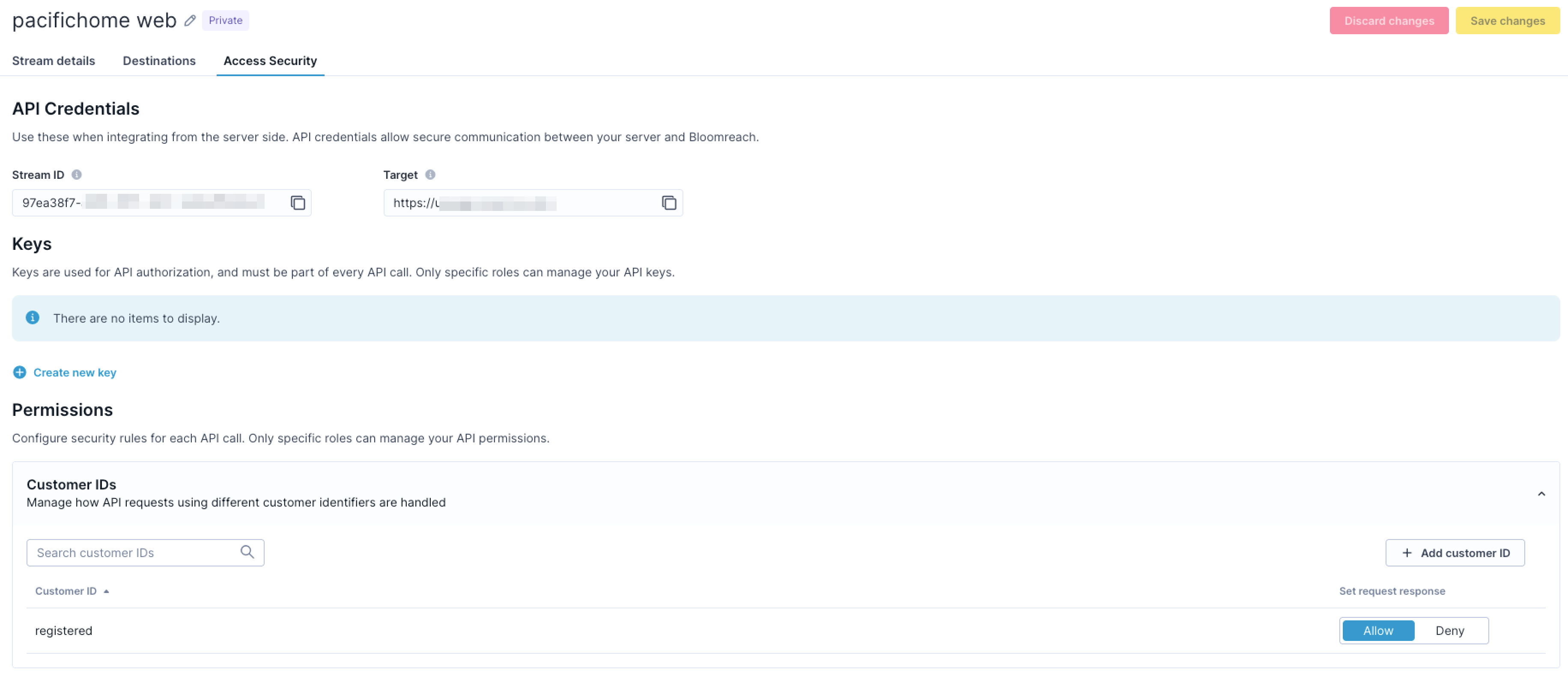 The system provides default permissions based on the stream’s type (public or private). You may need to customize these for your specific tracking needs. Your Bloomreach technical consultant will guide you on which identifiers, properties, and event types to allow for your use case.