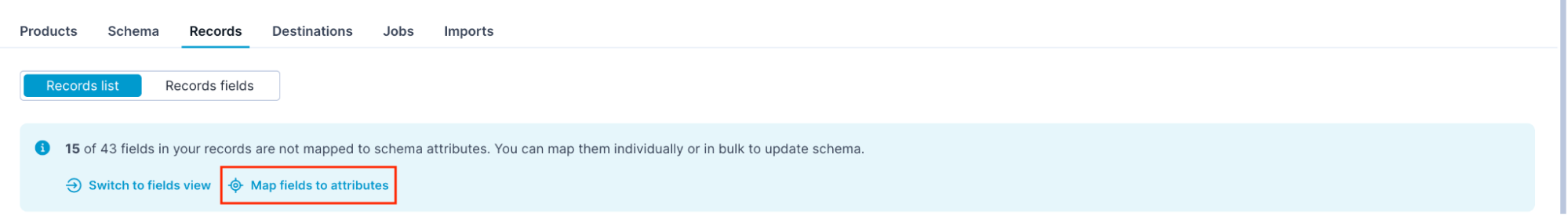 Click Map fields to attributes. The Map fields to attributes modal helps with bulk attribute creation based on your fields.