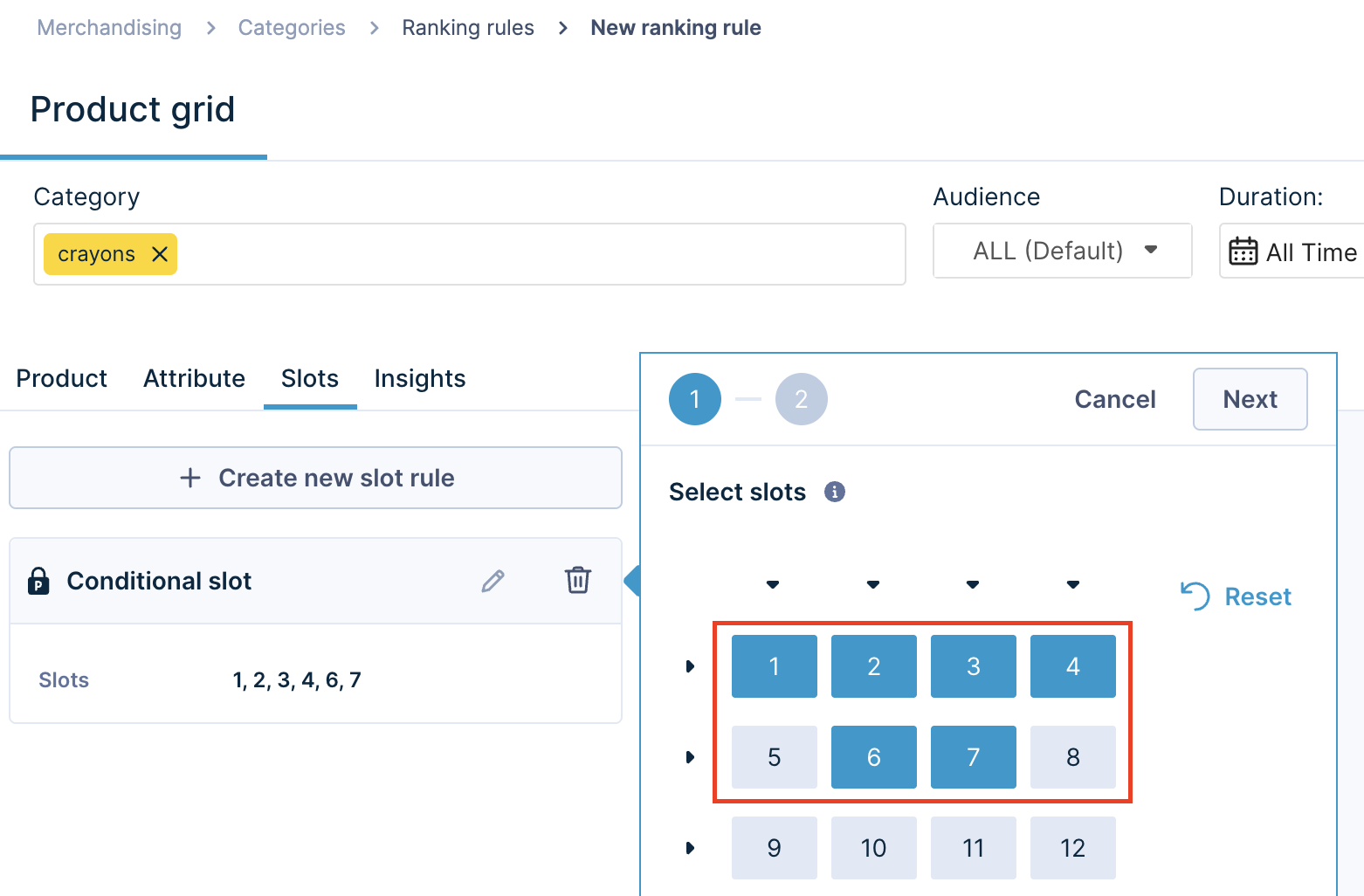 Handpick one or more slots from the product grid. This release adds the ability to select whole rows or columns.