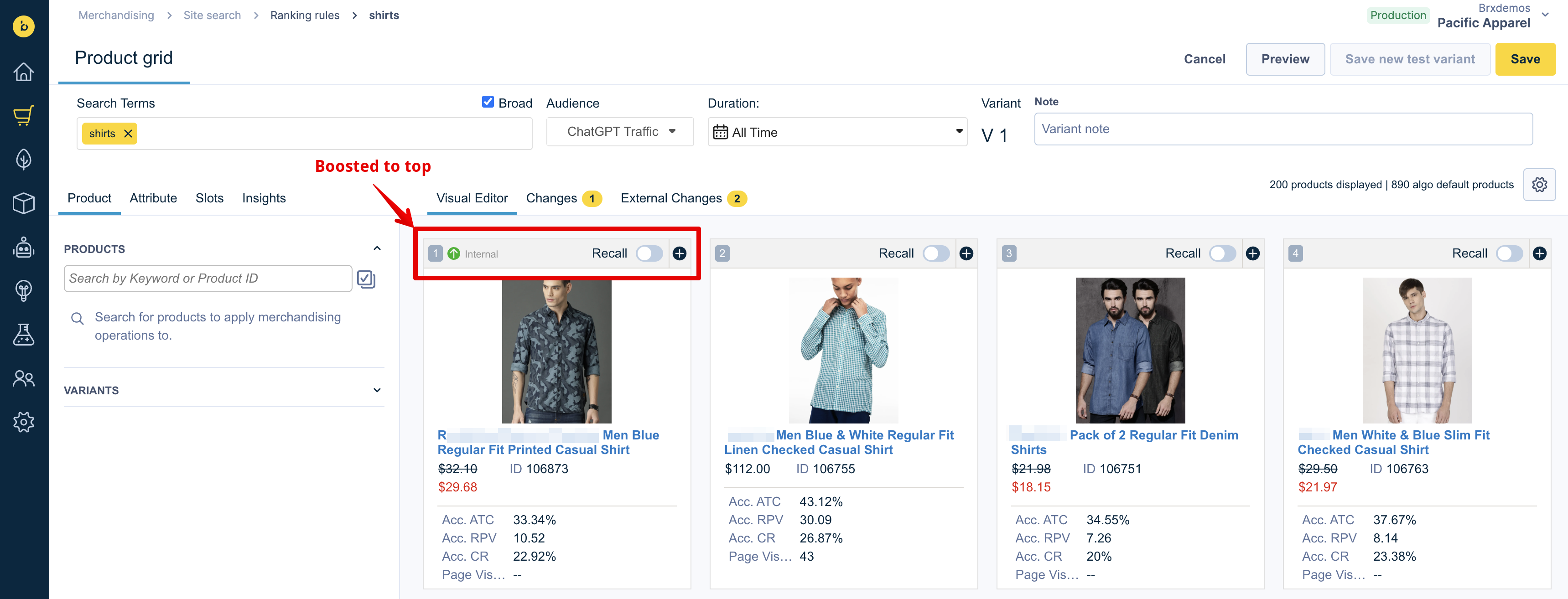 Testing the implementation by running searches in ChatGPT and verifying that the merchandising rules display different results from the website.