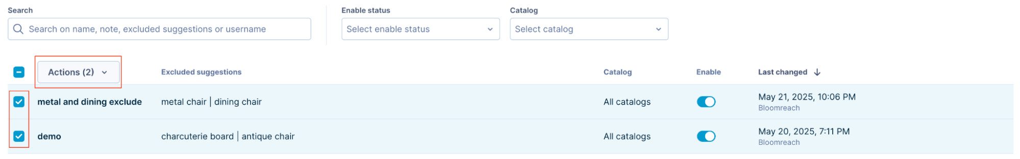 To enable, disable, or delete rules in bulk, check the boxes corresponding to the rules and select the action from the Actions dropdown menu.