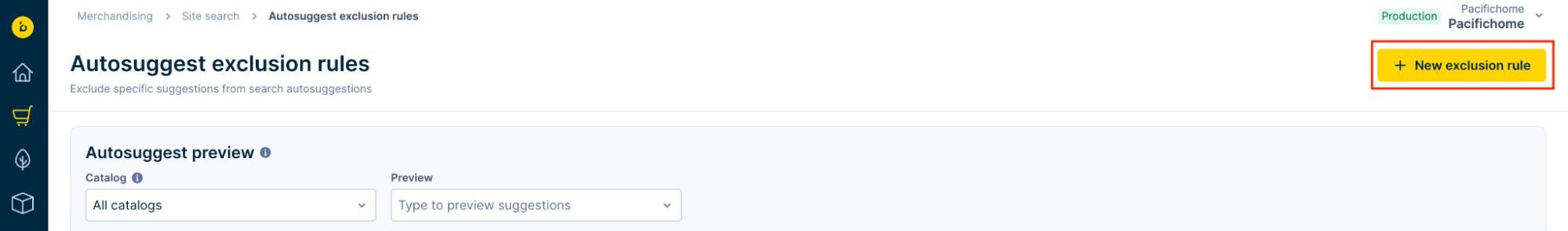 - Navigate to Merchandising > Site search > Autosuggest exclusion rules.