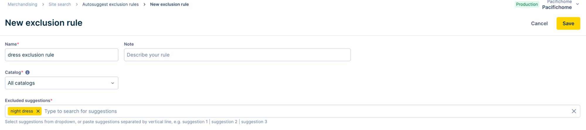 Autosuggest exclusion rules allow you to control which search suggestions appear when shoppers type in your search bar.