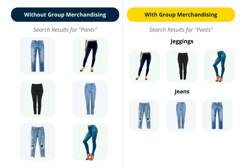 Group Merchandising also allows you to optimize the ranking of product groups as per your business goals. For example, you noticed that the “Jeggings” product group is trending on the "pants" search page. You can boost the “Jeggings” product group to position 1 and turn the trend into sales.