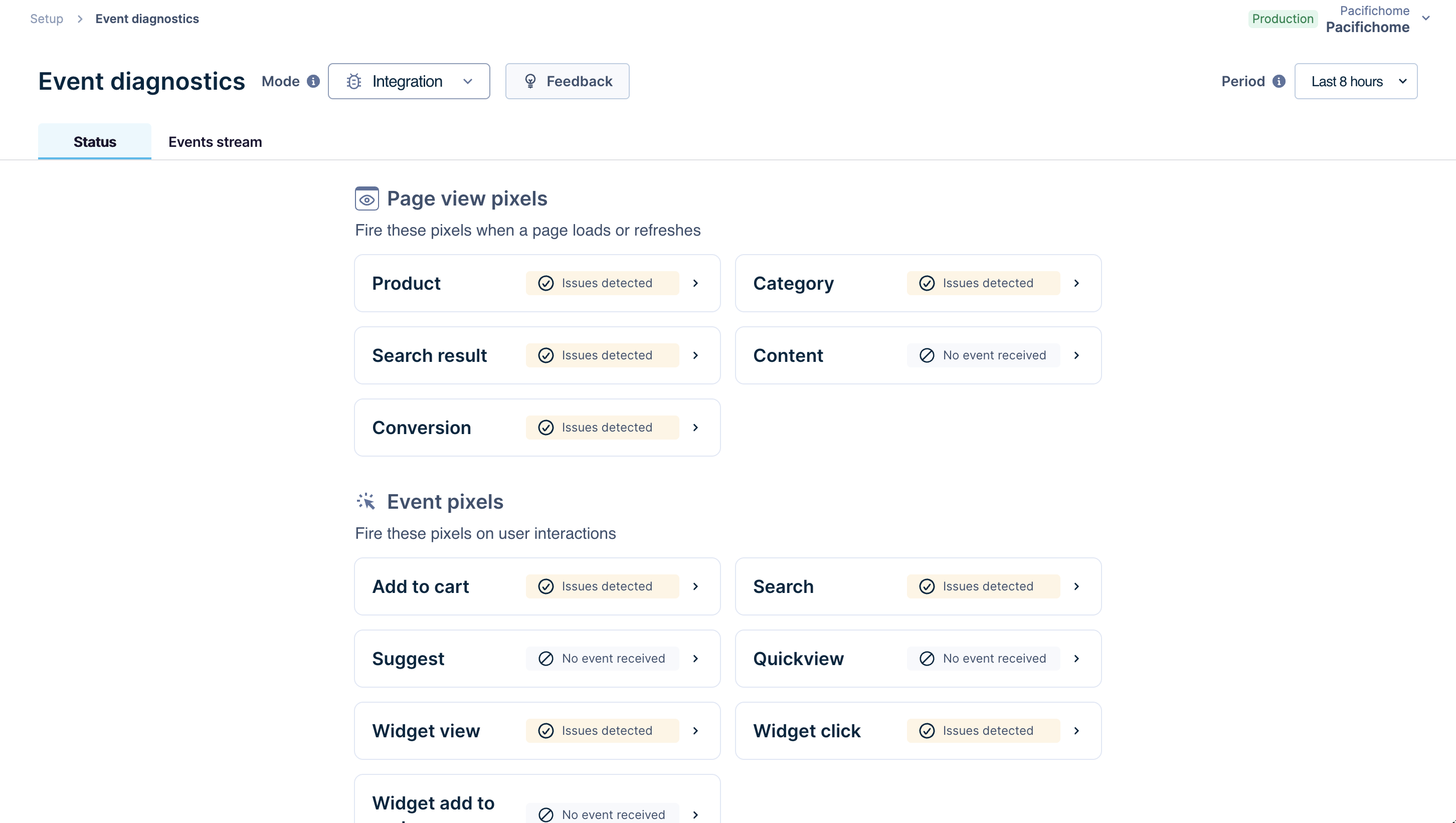 Once you are satisfied with the implementation, use the Event diagnostics tool in the Bloomreach dashboard to monitor the events coming in the Integration mode. Check the events stream for the server-side pixels, and review any detected issues in individual event types.