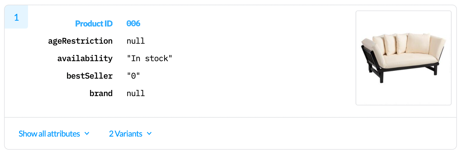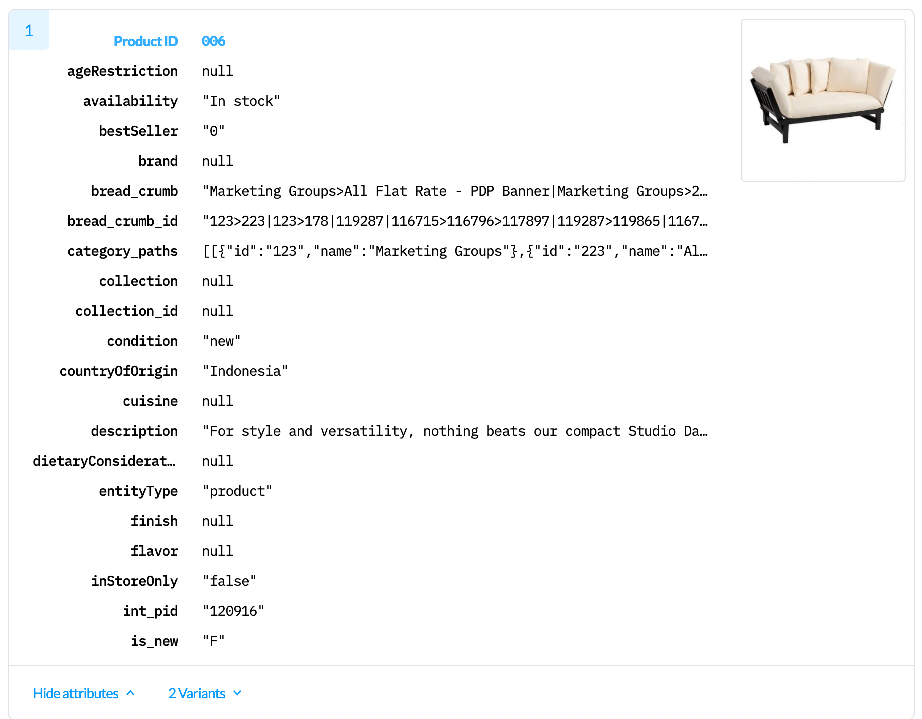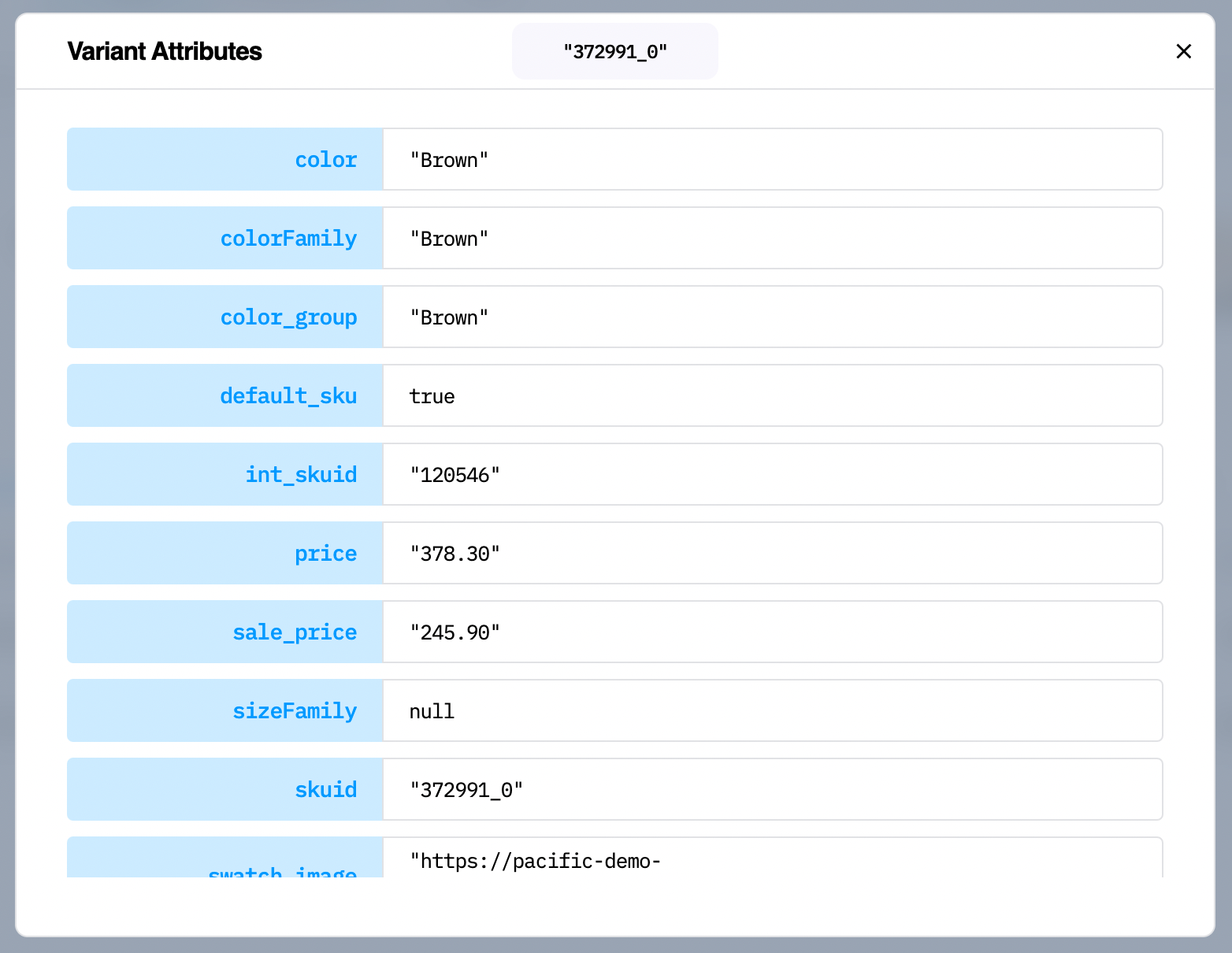 This displays a list of all product or item-level attributes along with their corresponding values. Values that begin and end in double quotes are string values; otherwise, they are the literal JSON value supplied in the feed. Values of the data can be copied to use elsewhere.