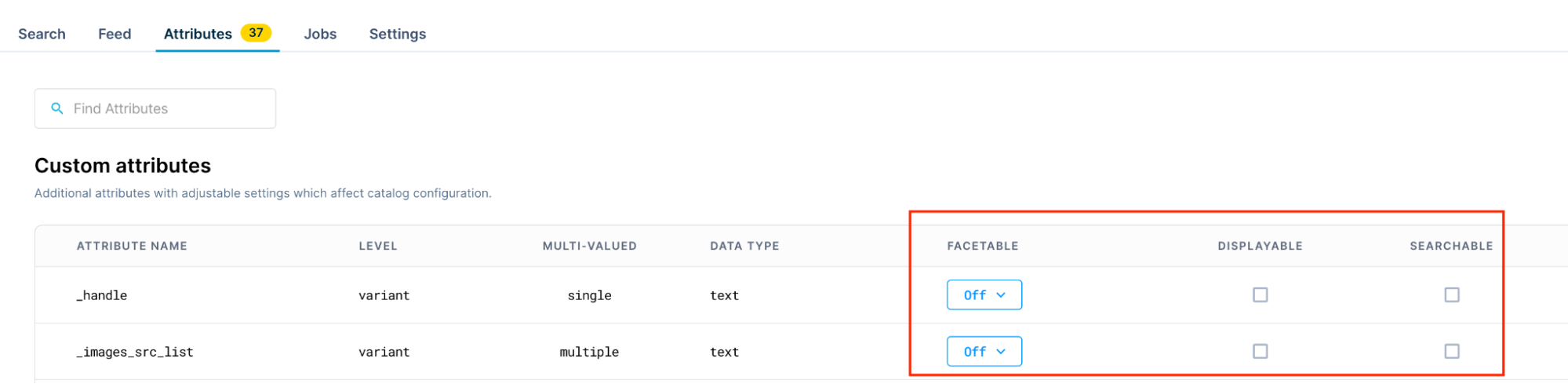 Configure only three settings in the Catalogs application: searchable, facetable, and displayable. Note that you can configure the settings of already created attributes in Data hub Item collections.