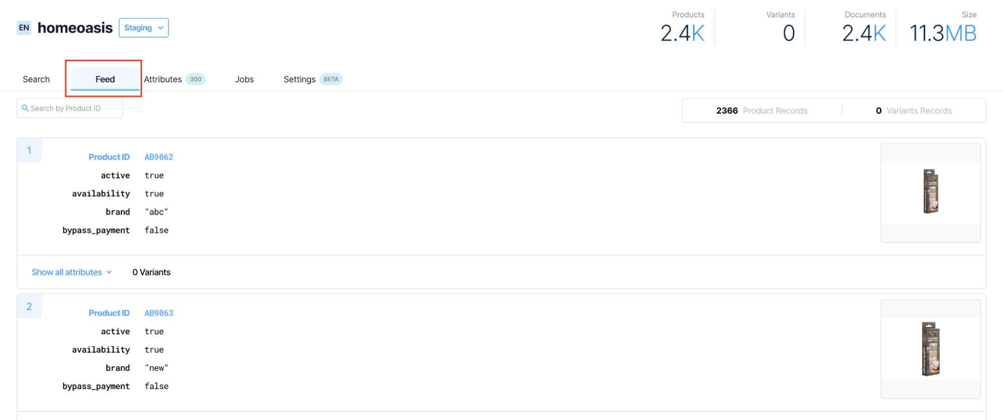 Use the search bar to search the feed data for a specific product ID. The same search feature is available for finding a specific variant in the list of variants. Note that the Product/Variant ID used here must be an exact match.