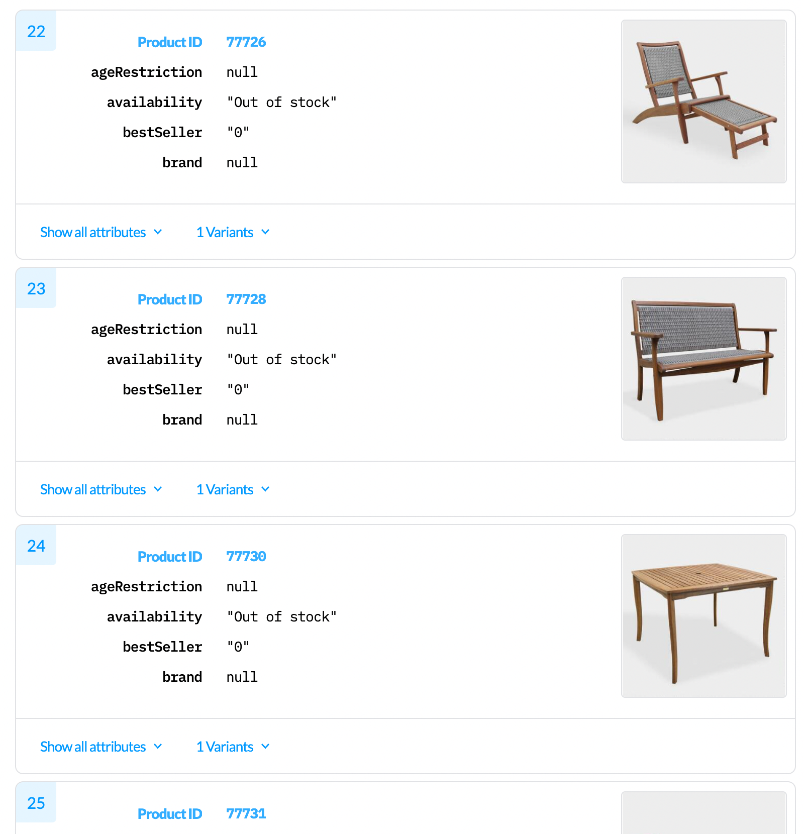 Each record lists the attributes related to that product or item. Initially, you see a set of 4 attributes in each product record. To view the complete list of attributes, click the Show all attributes dropdown.