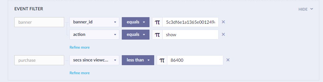 purchaseevent. Use your expression and set the condition to less than86400— that's 24 hours in seconds. This limits attribution to purchases made within 24 hours of seeing the weblayer.