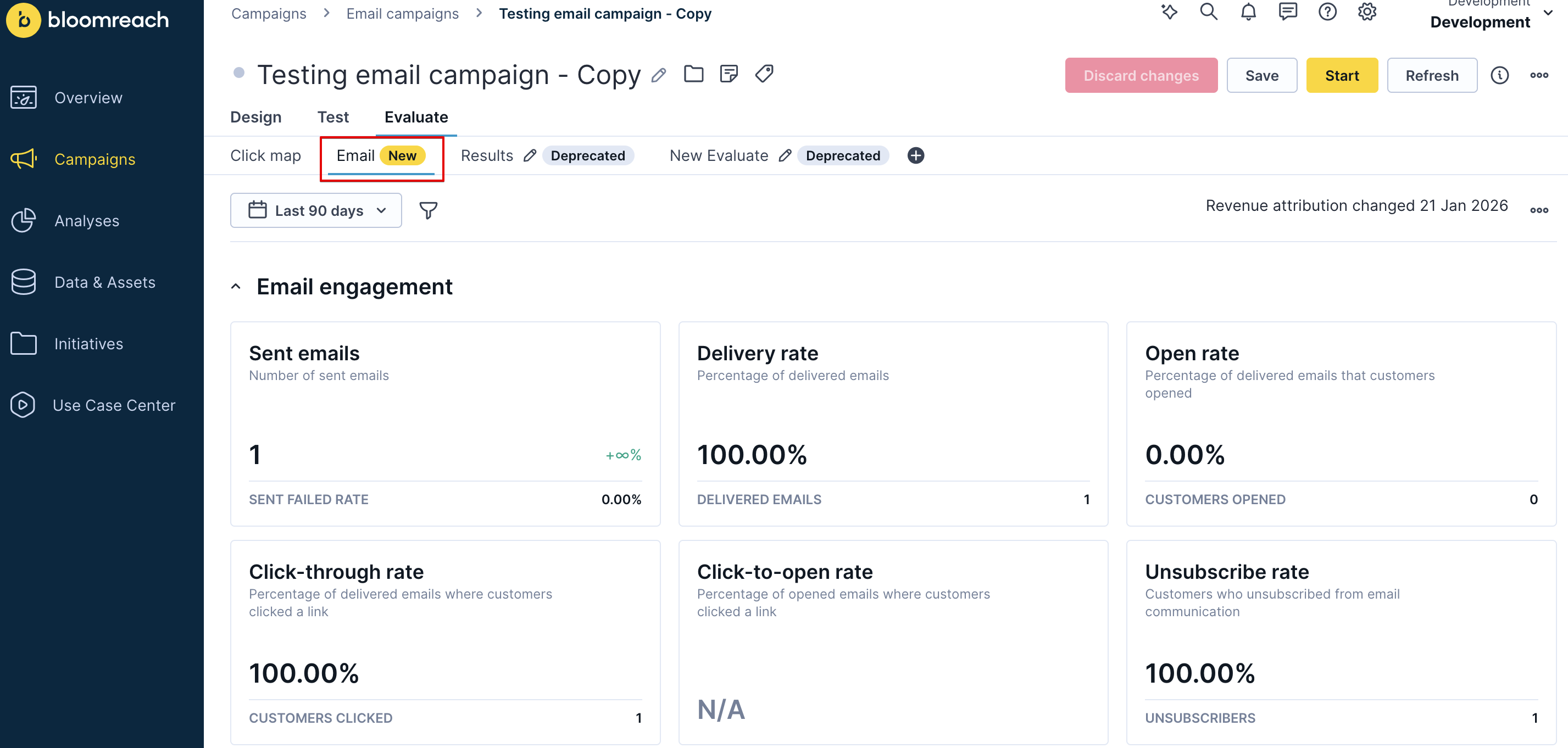 Campaign performance, part of the Performance dashboards, includes two dashboards: Scenario evaluation and Email campaign evaluation. These dashboards provide a comprehensive view of the revenue and engagement metrics for specific campaigns or scenarios. They help you track the performance of individual action nodes within your campaign.