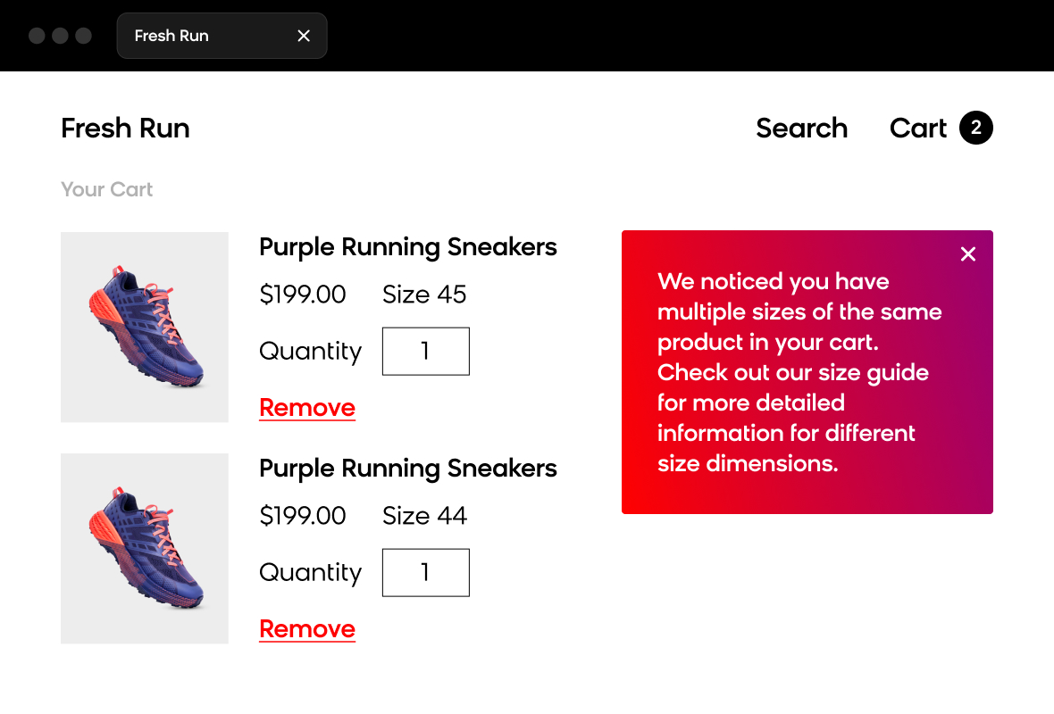 Reduce return rates and help shoppers find the right size with a real-time checkout banner that appears when customers add multiple sizes of the same product to their cart. This use case displays a dynamic banner that highlights duplicate items, leads shoppers to your sizing guide, and prevents accidental multi-size orders. By guiding customers to the right size before purchase, you can decrease return rates and improve customer satisfaction.
