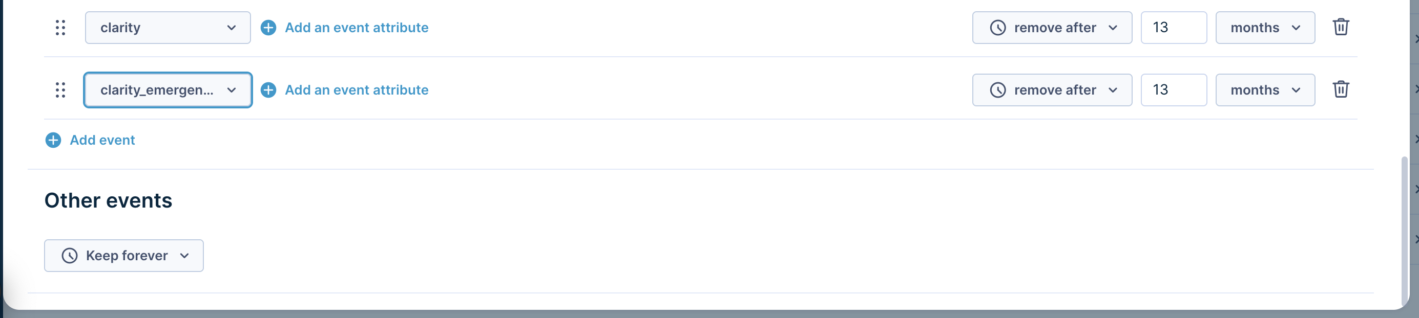 We recommend that you set the expiration period for the clarity and clarity_safety events to 13 months. This expiration period helps: