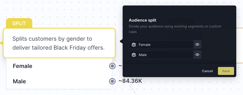 - Split conditions (for example, gender, purchase history, loyalty tier).