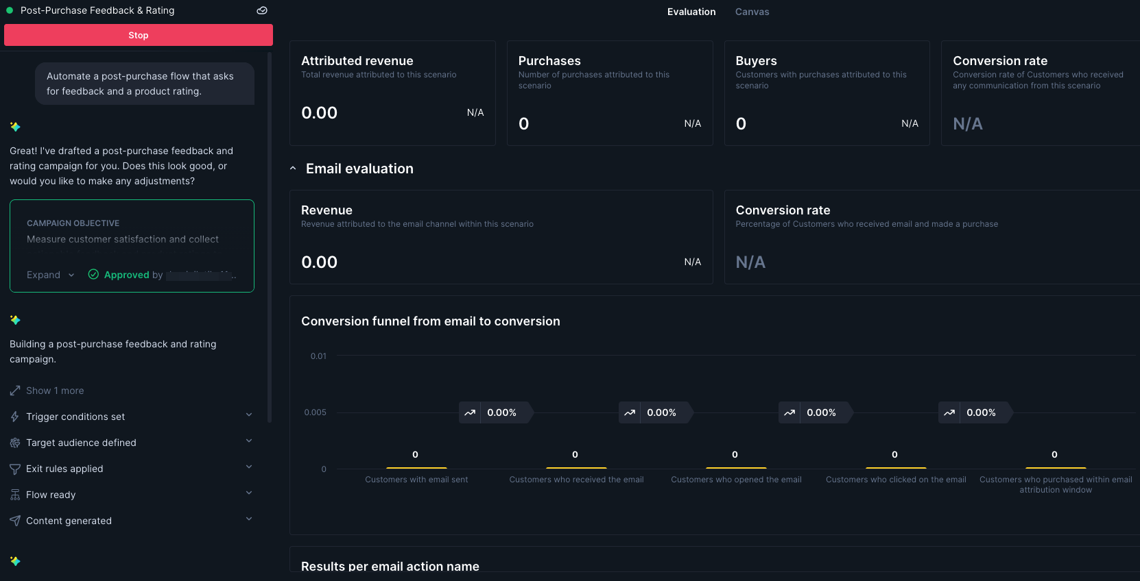 You can also review conversion funnel charts and results per email action, helping you measure impact and identify optimization opportunities.