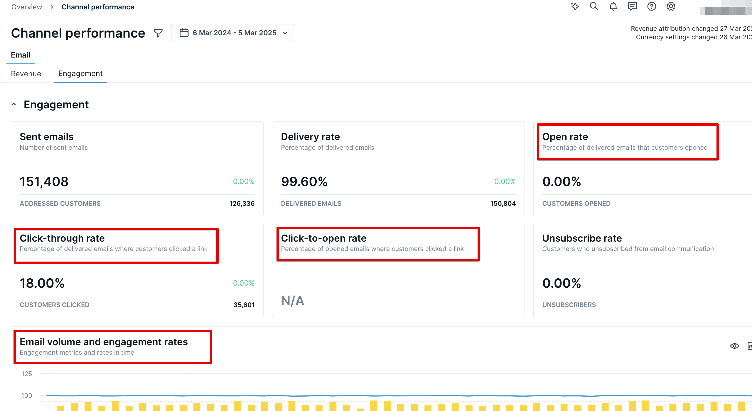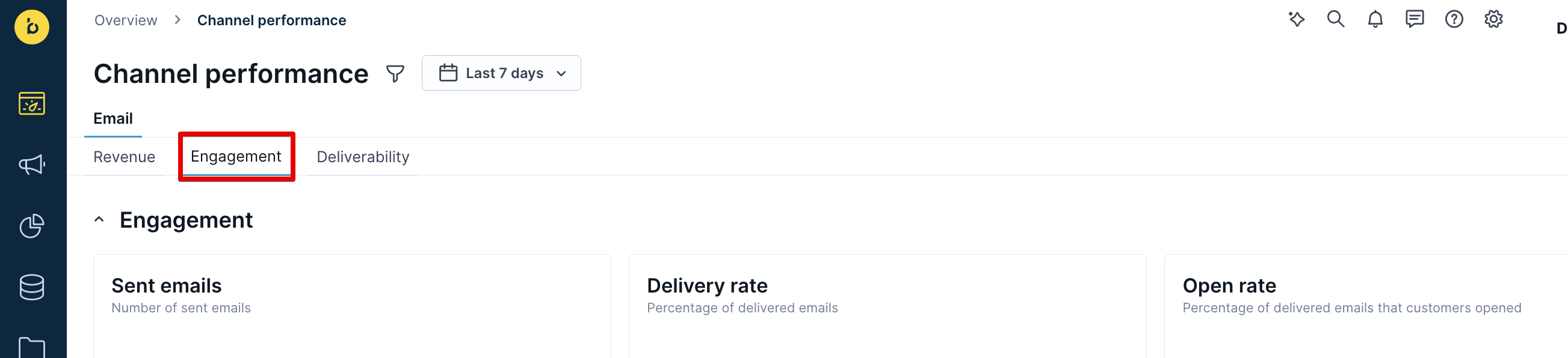 Email engagement dashboard is part of the Channel performance dashboards within Performance dashboards. It provides a clear overview of your email campaign performance, including metrics such as: