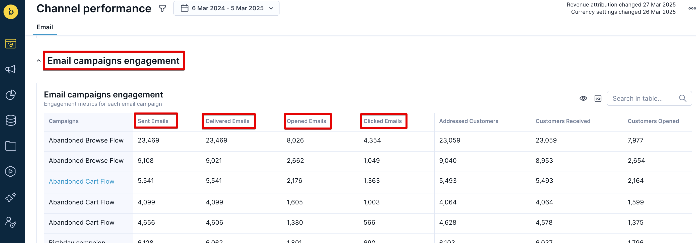 You want to optimize your email marketing efforts and focus on high-performing campaigns. Use the Email campaigns engagement table to identify campaigns with low Opened emails, Clicked emails, or Conversion rates compared to your other campaigns.