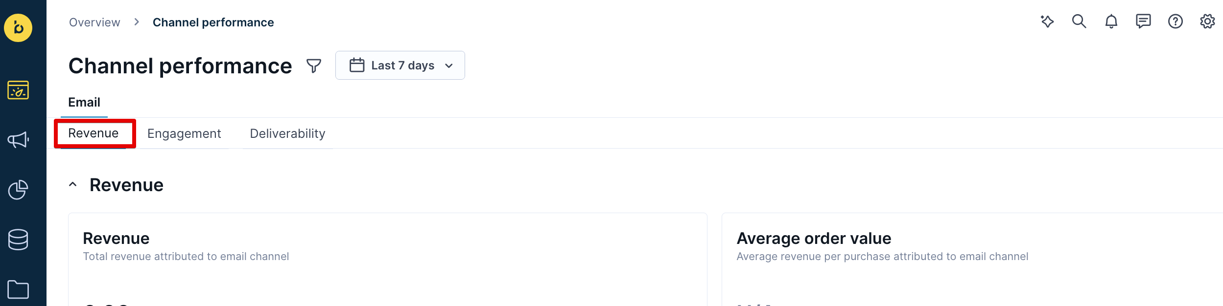 Email revenue dashboard is part of the Channel performance dashboards within Performance dashboards. It offers insights into the revenue produced by your email marketing efforts. It calculates key metrics, including:
