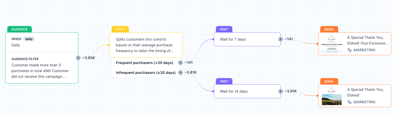 - Split nodes: Segment audiences for personalized paths (when applicable).