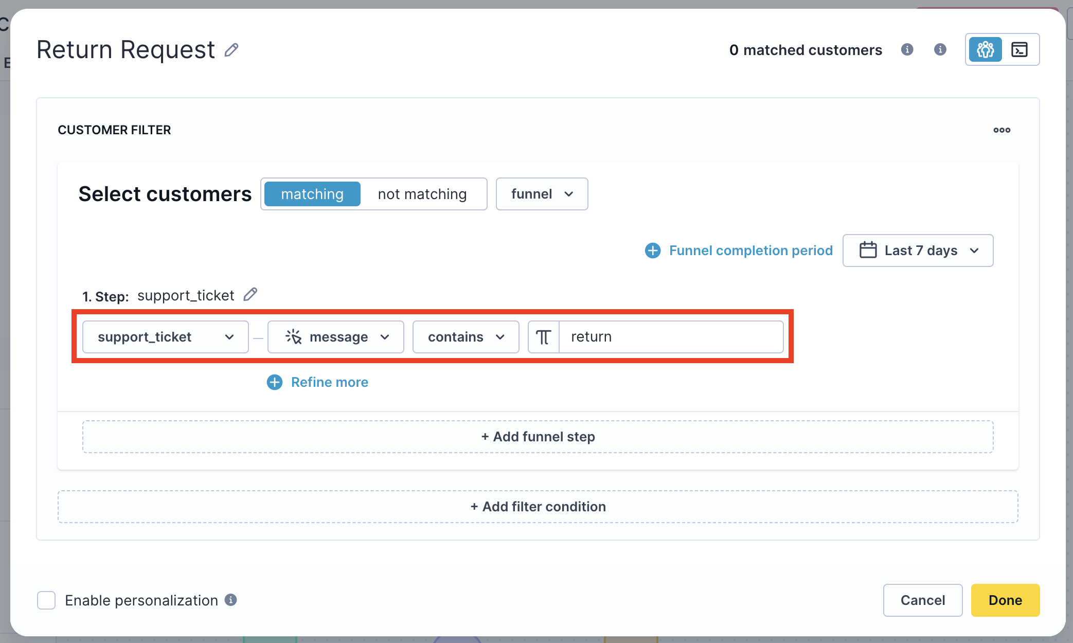 In the condition node, filter the types of tickets you want to target — for example, complaints or tickets whose messages include specific words such as "return." Adjust the time period to 7 days to focus on customers who recently had a bad experience. You can also add conditions such as: