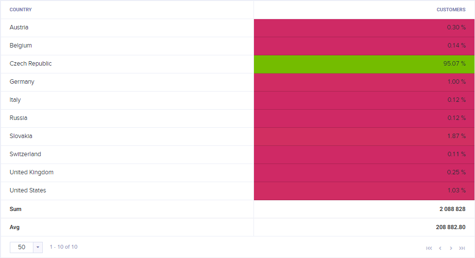 Metrics compute values in the table according to the drill-down specified in rows and columns. For example, metric customer count, when combined with session start > country attribute in rows, will compute how many customers started a session in given countries.