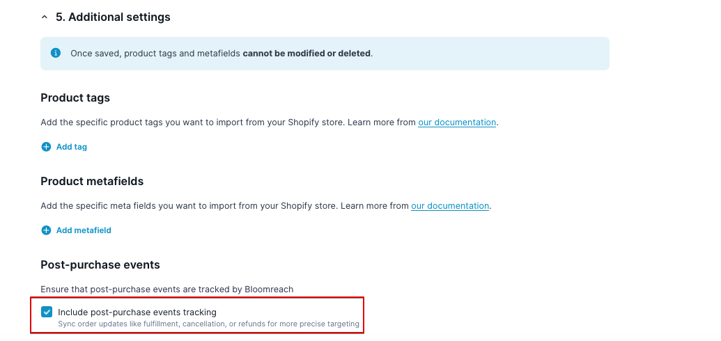 Post-purchase events tracking is disabled by default for existing Shopify integrations. Click Include post-purchase event tracking to enable them manually.