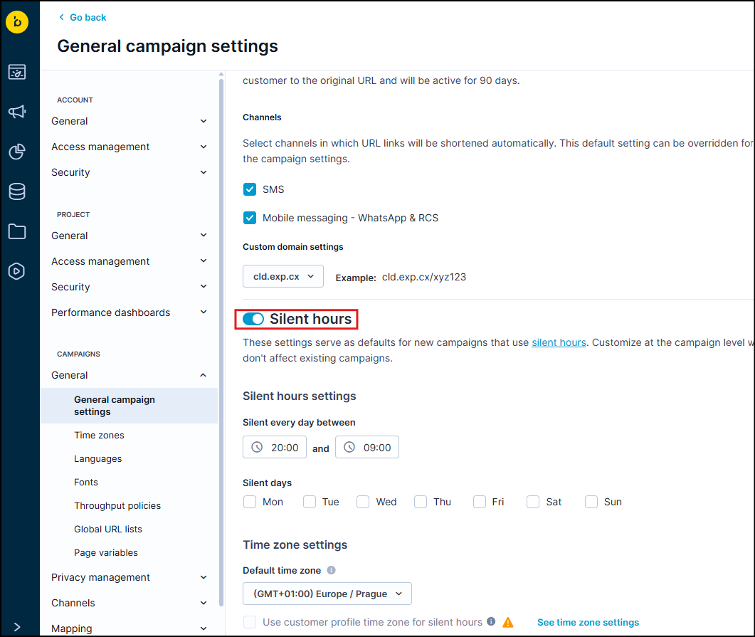 Silent hours block campaign sends during specified time periods to prevent messages from reaching customers at inconvenient times. Use this feature to comply with messaging channel regulations, improve customer experience, and reduce unsubscribes.