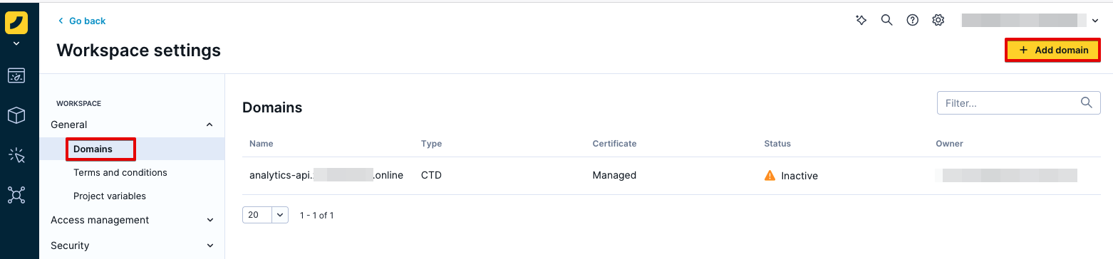Go to the settings menu by clicking on ⚙ in the top right panel. You will find domain management under Workspace settings > General > Domains. You need account-level permissions to access this section. To add a domain, click the + Add domain button at the top right of the Domains page.