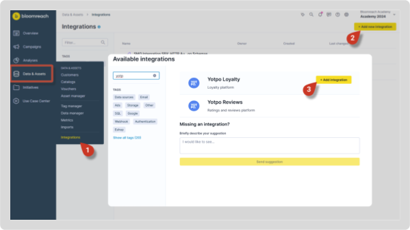 This guide shows you how to integrate Yotpo Loyalty with Bloomreach. The integration enriches your marketing strategy with loyalty and subscription data, helping you boost customer engagement rates.