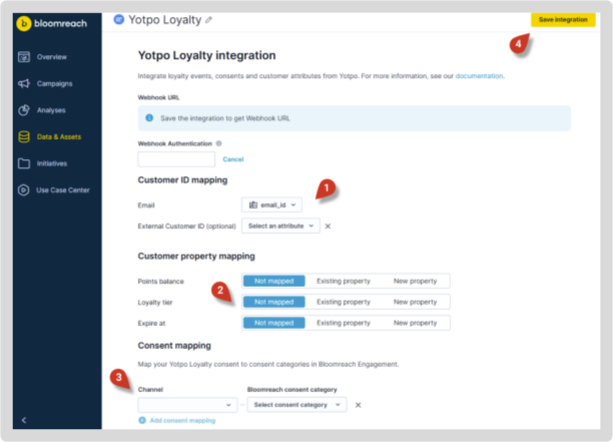 - Configure Consent mapping if you want to track Yotpo Loyalty consents inside Bloomreach and specify which consent category to use.