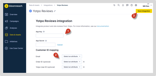 You will set up the Yotpo integration in Bloomreach only. The integration automatically connects once you provide your Yotpo credentials.